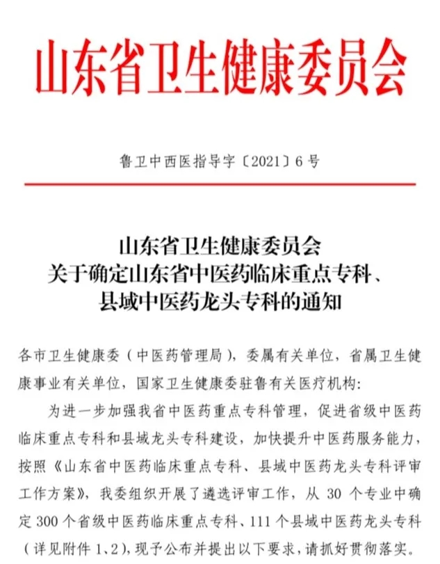近日,在山东省卫生健康委员会下发的《关于确定山东省中医药临床重点专科、县域中医药龙头专科的通知》中,淄博市中医医院儿科、肺病科、妇科、内分泌科、急诊科、脾胃病科、肾病科、临床药学、治未病科九个科室榜上有名,被评为山东省中医药临床重点专科。